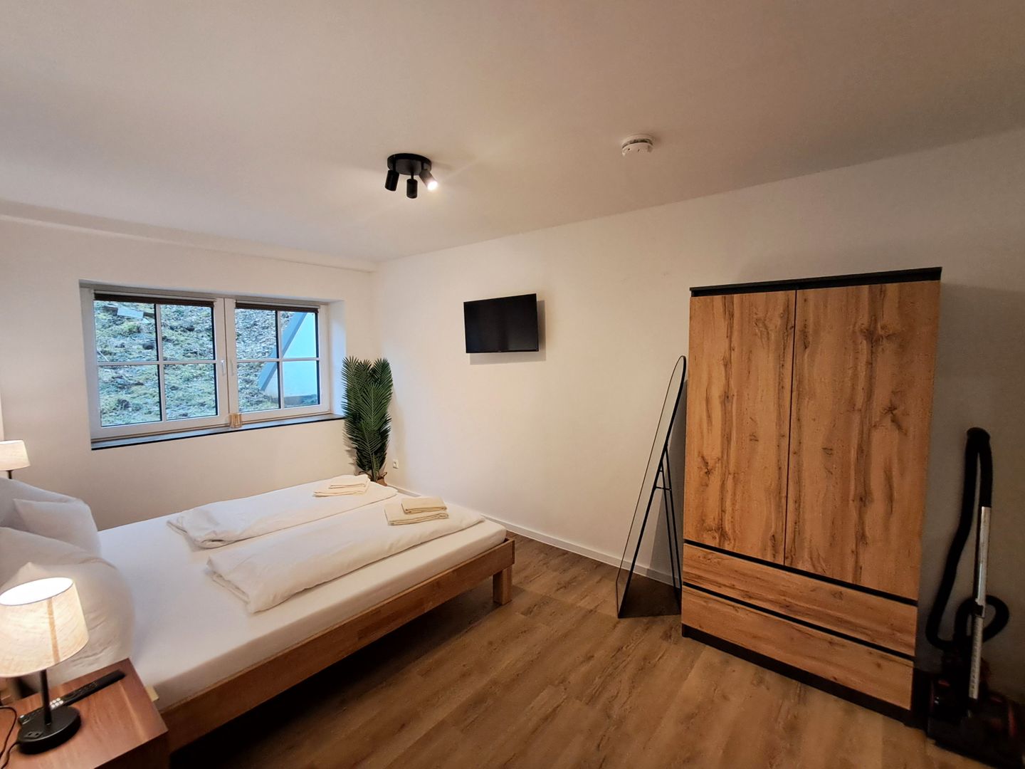 The **bright living area** invites you to relax with a cozy sofa corner, **3 TVs with satellite connection**, and **Wi-Fi**. A dining area with a table offers space for shared meals and is complemented by a wardrobe, chest of drawers, and a full-length mirror. **Underfloor heating** ensures pleasant temperatures, and all windows are equipped with **privacy protection**.